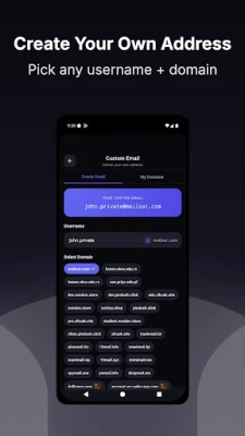 Choose your own username and pick from dozens of domains. Premium users get access to .com, .net, .org, .io, .dev, and .app domains.