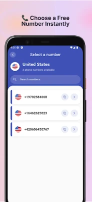 1. Select a Country: Open the app and choose the country (e.g. USA, Canada, UK, Australia) for your temporary number. A list of available virtual numbers will appear.