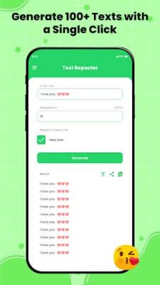 As one of the top tools for repeat text, duplicate text, text generator, repeated messages, and more, Text Repeater - Repeat & Copy is widely loved for its versatility. It's perfect for creating stylish text art, personalizing messages, and crafting standout social media posts. The simple, intuitive design makes it accessible for anyone who wants to generate repeated text efficiently.