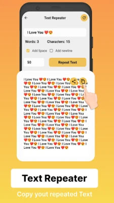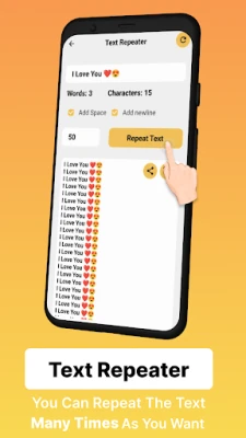 Text Repeater is a useful tool for producing lengthy text blocks for testing purposes or for creating multiple instances of a particular word.We are always trying to improve and add additional features to the "Text repeater app" so that you and your friends who are text spammers can enjoy it even more. In order to establish Text Duplicator as your preferred app, we require your unwavering support. For any questions, concerns, recommendations, or just to say hello, don't hesitate to email us. We hope to hear from you soon.