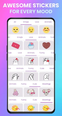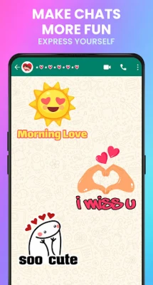 Send romantic stickers, funny text stickers, good morning greetings, cute emojis, and expressive animal stickers in every chat.