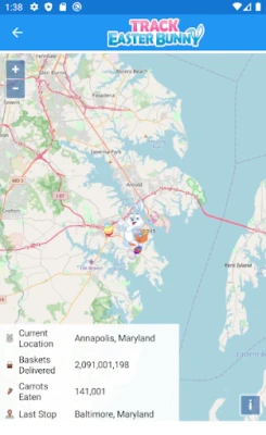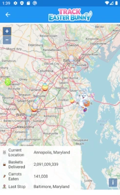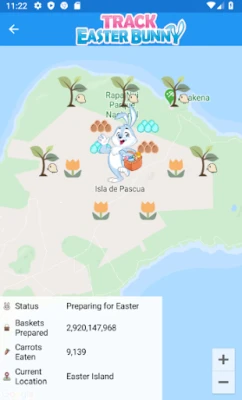 With the Easter Bunny Tracker, you will know the Easter Bunny's exact whereabouts during Easter. You can interact with the tracker and zoom and pan the map so that you can follow the Easter Bunny on his journey from Easter Island as he delivers eggs and candy all around the world to kids of all ages.