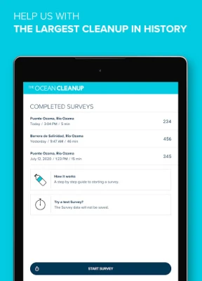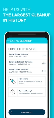 Why use The Ocean Cleanup Survey App? It is fun, it is easy, and it generates important global data for citizens, scientists, and decision makers to move forward in reducing ocean plastic pollution. By using The Ocean Cleanup Survey App you can join our mission to rid the world’s oceans of plastic and become part of the largest cleanup in history.