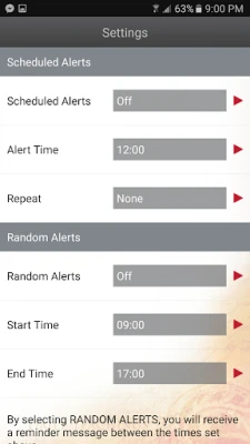 Key features include scheduling specific times for alerts, selecting time frames for random alerts, bookmarking, and sharing.