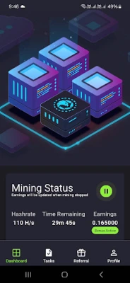 Ads Mining: Maximize your earnings! Watch an ad to activate a 60-minute mining session.