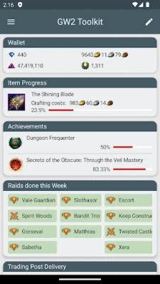 This unofficial App supports you to keep track of your current projects in Guild Wars 2. See how much progress you have on crafting your legendary and how much gold you have to spent to finish it.