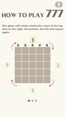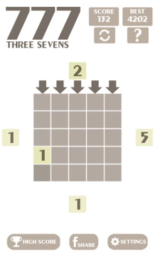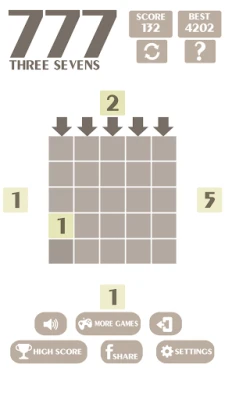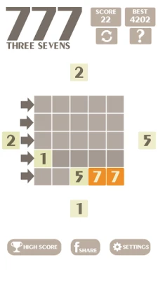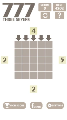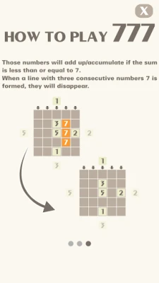 * How to play: - The game will rotate clockwise, start at the left then to the top, the right, the bottom and repeat again. - Each side will have a random number from 1 to 5. You have to select a place by clicking/taping on the arrow to move/drop the number inside the board (big square). - Those numbers will add up/accumulate if the sum is less than or equal to 7. - When a line with three (or more) consecutive numbers 7 is formed, they will disappear. - We can touch/tap on the board (big square) to move/drop the number.