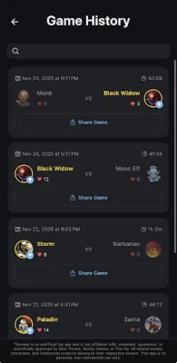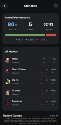Track your wins, losses, and win rate automatically. View character-specific performance to see which heroes you dominate with. Browse your recent game history with detailed match information. Export your data for backup or manually log games played offline.