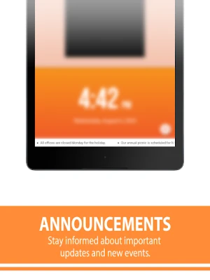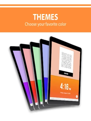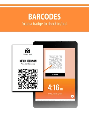 * Easy to read time and date * Users can quickly check in or out by scanning their barcode badge * Print Barcodes (using your device or via the website) * Change between several different themes to customize your experience * Presents company announcements