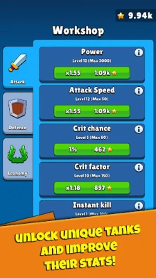 Dive into a world of epic clashes as you grow your army. Unlock unique tanks, improve your tank stats, and prove your skills in crazy tank wars and tactical tank tussles. Manage resources wisely and strategically enhance your tanks to achieve victory in every battle.