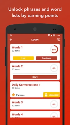 - Earn points by learning and practicing. Then unlock phrases and word lists.