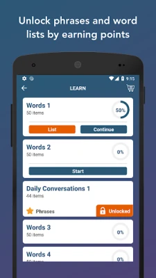 - Earn points by learning and practicing. Then unlock phrases and word lists.