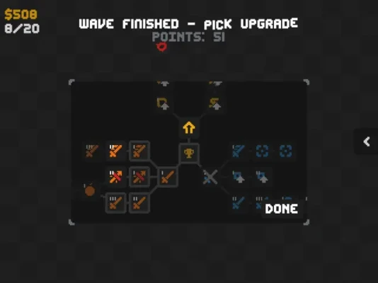 After finishing a wave, you may pick an upgrade to buff your turrets, choose wisely! Going for the Shooter path blocks you from following the Arcane one.