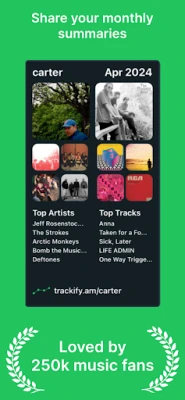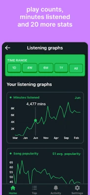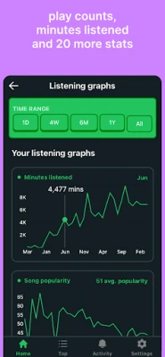 ⏰ Exact listening counts on your full account history 📈 Top Artists, Songs, and Albums for any time range 🤼 Compare your listens with friends & our other users 🥙 Spotify Wrapped all year round 🥇 First listened-to dates for all your favourite songs & artists ➕ many more features that we can't fit here!