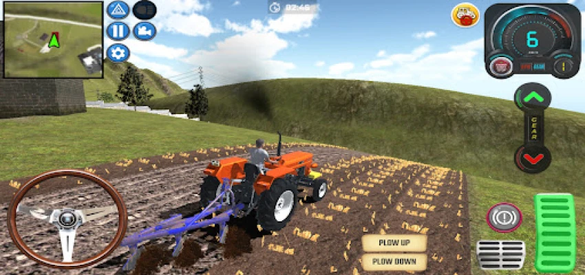 In the Excavator Tractor Farming Simulator, all vehicles feature an interior camera, and dashboard indicators such as speed and engine RPM are fully functional. The game map resembles village life, offering a scenic countryside experience with natural landscapes and the sounds of animals, allowing you to immerse yourself in farming life.