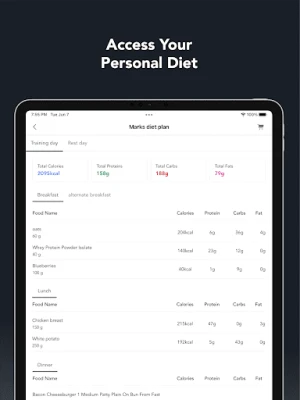You will have access to your personalized meal plan and nutrition log so that you can keep track on your diet. We understand that acheiving your fitness goals requires commitment and accountability. Thats why we have data tracking, daily habits and check-ins. In-App messaging to keep you on track and push notifications for reminders to complete your daily habits.