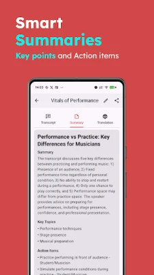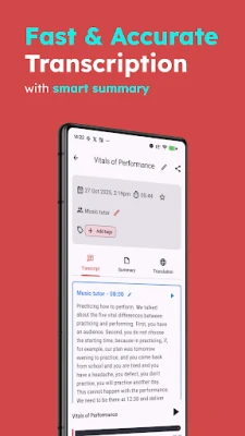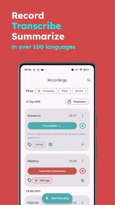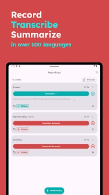 - Summaries: Automatically summarize long audio into concise notes.