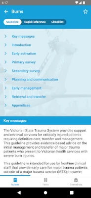 The Trauma Victoria Rapid Reference guidelines are interactive allowing for real time use during care of Major Trauma patient. This includes quick dial case management assistance from Adult Retrieval Victoria and Paediatric Infant Perinatal Emergency retrieval.