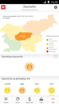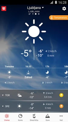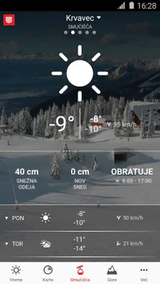 Ljubiteljem gora in smučanja zagotavlja pregled trenutnega vremenskega stanja in napoved za prihodnje dni. Če za smuko še niste povsem odločeni in ne zaupate vremenskim podatkom, si lahko v aplikaciji preverite dejansko stanje na smučišču kar preko 130-ih kamer v živo.