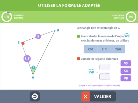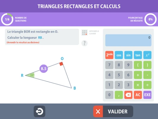 Le dernier exercice est paramétrable : Nombre de questions, choix des lignes trigonométriques, calculs de longueurs et/ou d’angles.