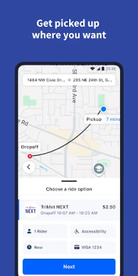 Requesting a ride on NEXT is easy — here's how it works: Tell us where you want to go The app uses your location and matches you with a friendly NEXT driver who knows where to pick you up Pay the regular TriMet fare on board using your Hop card, phone or contactless credit/debit card After you ride, you may be asked to rate your experience