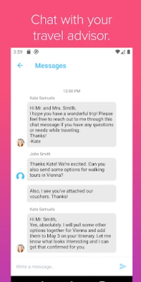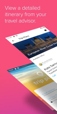 - See a summary of your trip with how many events you have on each day. - On each day, view detailed information for each event. - Quickly pull up phone numbers and navigation for the places on your trip. - Quickly contact your travel advisor if issues come up.