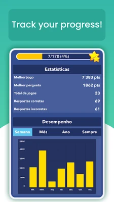 Trivial Quiz - The Pursuit of Knowledge shows a set of statistics for you to stay on track of your performance in the game and always try to improve your maximum!