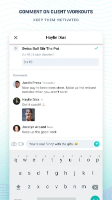 • Receive push notifications when clients send messages, complete workouts or post comments on workouts