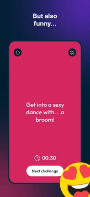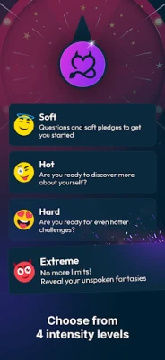 From romantic to daring, every game is different. The categories offer progressive levels of intensity, allowing you to choose the perfect atmosphere: relax with lighthearted challenges, or dive into intimate questions and bolder actions.
