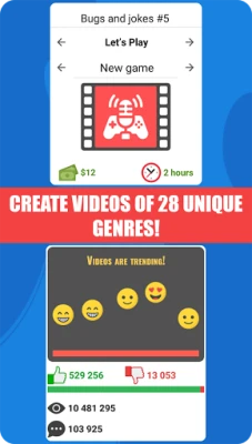 - The game features 28 different genres, ranging from vlogs, reactions, letsplays, and challenges, to popular science, interviews, shows, and mystery! Each genre has several sub-genre options for you to choose from: for instance, you can choose the "Let's play" genre and put your favorite game in the sub-genre, thus creating a video on the playthrough of any game! Or you could choose the "popular science" genre and pick a space theme. Open your imagination and start creating!
