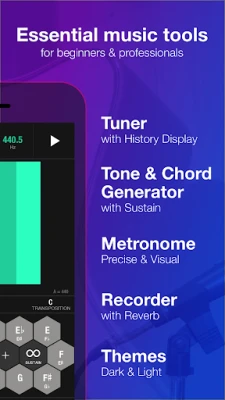 • Clear, visual tuner with note, octave, cents (+\-), and frequency (hz) display