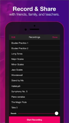 Record your practice and performances. Add reverb for a professional sound. Share recordings through e-mail, SoundCloud, Dropbox and more.