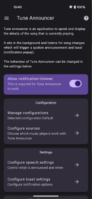 To enable this functionality Tune Announcer needs to view your media notifications and must be given access to them via the system settings.