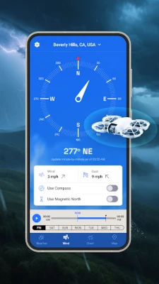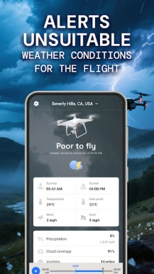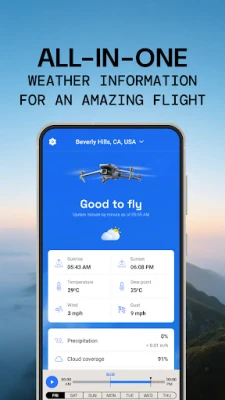 - Good-to-fly threshold: Base on weather metrics, and your drone models, we will suggest you best times to fly - Real-time alerts, the app will notify you of any changes in conditions that could affect your drone flight, including the arrival of storms or sudden weather changes.