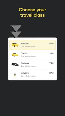Here you choose preferable car class: standard, comfort, business, station wagon, minibus or eco.