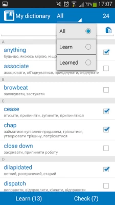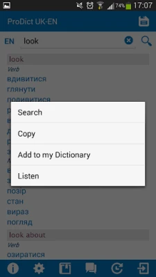 Simple, fast, convenient Ukrainian - English and English - Ukrainian dictionary which contains 177027 words. The Dictionary is OFFLINE and does not require an Internet connection. The dictionary contains the vocabulary trainer. This is an easy way to learn new words