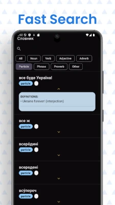 Simple Ukrainian-English dictionary with over 40,000 entries, including nouns, verbs, adjectives, particles.