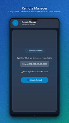 Open Ultimate File Manager Pro and navigate to "Remote Manager." Set a custom 4-digit PIN and start the server. Open the provided local URL (e.g., http://192.168.1.100:8080) in any web browser. Enter your PIN and you're in!