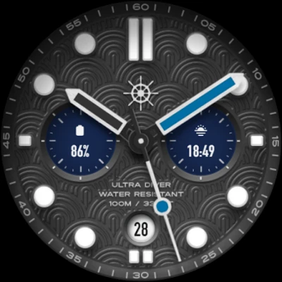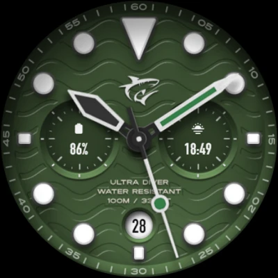 Inspired by classic analog dive watches, the Ultra Diver watch face for your Wear OS smartwatch offers extensive customization, including multiple color options, three watch hand styles, and various textures for a truly personalized look.