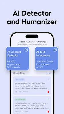 On the main page, you will see two options, AI Content Detector and AI Text Humanizer, along with recent files. Choose the Undetectable AI Text Humanizer since you want to humanize AI text.