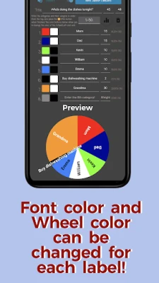2.Enter the entries on the left and their weights on the right in the center text boxes, starting from 1 without skipping. Use the color changer to customize font and wheel colors for each entry