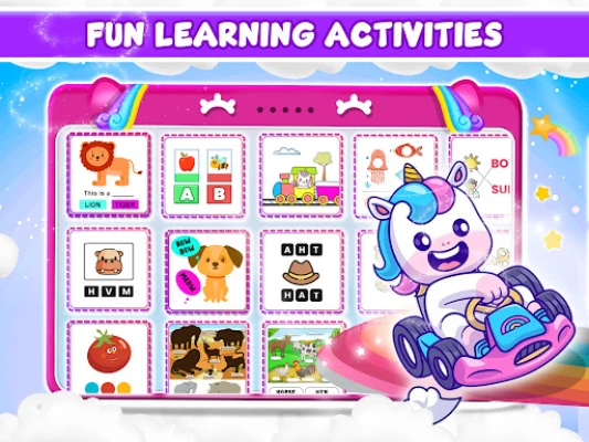 Includes fun mini games like Unicorn prank calling & chat, unicorn computer and tablet, musical instruments, musical band, unicorn toy phone, animals playing music, memory match, balloon pop, and more!