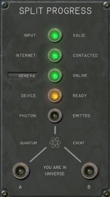 Universe Splitter will then, over the internet, activate a remote "Quantis" brand quantum device (made by id Quantique, and certified by the National Metrology Institute of Switzerland) which will send a single photon into a quantum "either/or" state. According to current scientific thinking, though, the photon will actually be in a "both, but in separate universes" state!