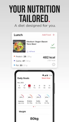 • 7-Day Meal Plan – Tell the app how many meals you eat and any allergies or dislikes you have. Your weekly meal plan is automatically created with delicious new recipes daily that fit your nutrition targets. Choose from hundreds of vegetarian, pescatarian or omnivorous diets and recipes. Vegan options are coming soon