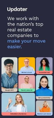 Thousands of real estate companies — like your new apartment community, real estate agent, or moving company — partner with Updater to help you organize and complete your move. We know how stressful moving can be, so we provide end-to-end moving support to help you save time, money, and get settled into your new home. With Updater, you can quickly and easily: