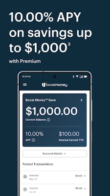 ³For Boost Money™ Save accounts, the 10.00% Annual Percentage Yield (APY) up to a $1,000 balance requires a Premium subscription ($9.99/mo). Balances over $1,000 with Premium earn 3.05% APY. Without a Premium subscription, the APY for the Boost Money™ Save account is 1.50% on all balances. The APY is effective as of 10/31/2025, is variable and may change at any time. Certain fees, such as outbound wire transfers or RTP, may impact earnings. Please refer to the applicable Cross River Bank Savings Deposit Account Agreement and Truth in Savings Disclosure.