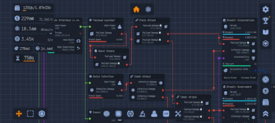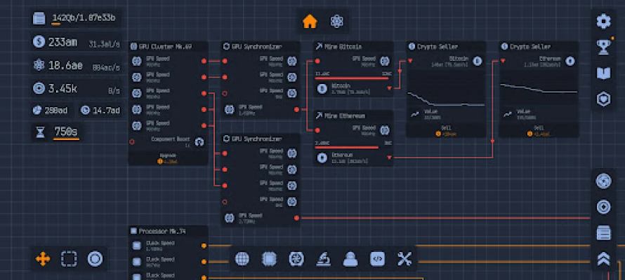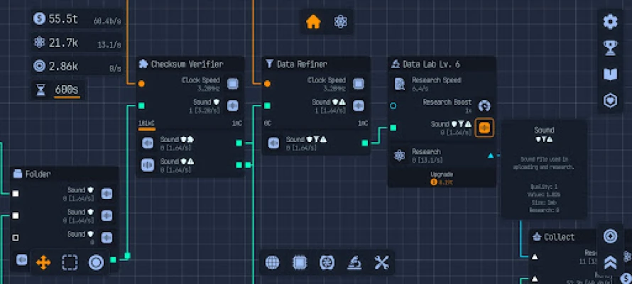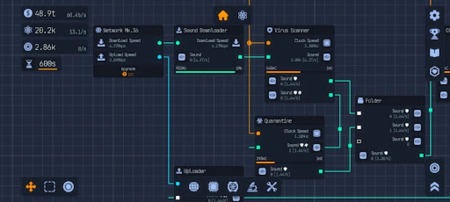 Welcome to the Labs! In Upload Labs you are tasked to save the universe from the inevitable heat death. Use your ingenuity and power to build optimized systems using a node-based system. These nodes are window-like interfaces representing components and processes within your computer. You will connect nodes from output to input to control resource flow and data pipelines
