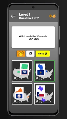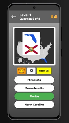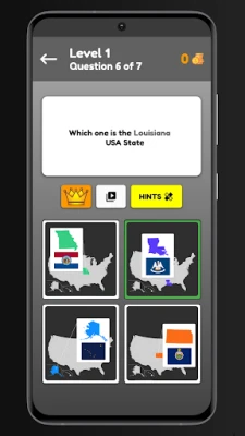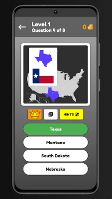 How To Play This Game? On the quiz page, you see an image of a US state map with a flag and you had to gauss right name of that state from four options below, if get Right you get points which you can your for hint for the hard questions