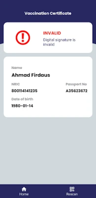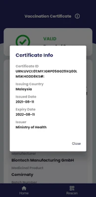 The Vaccination Certificate Verification (VCV) Application is a Malaysian Government application to verify the COVID-19 vaccination certificate issued by the Malaysian government; and also by other countries, as recognized by the Malaysian government. This app will also verify certificates for COVID test outcomes and recovery by some countries.