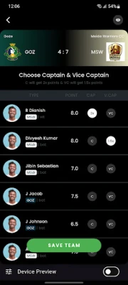 Choose your captain and vice-captain for maximum points.